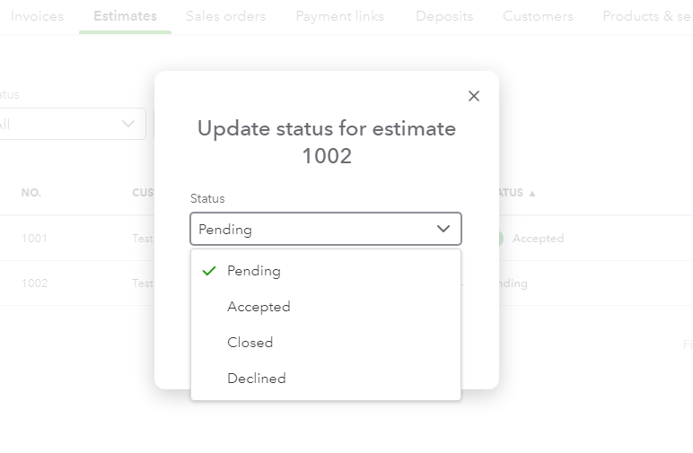- By default, a new estimate is marked as “Pending“. If you want to change this, click on the dropdown arrow next to Pending and choose a different status.